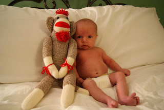 | 1 month (forgot the onesie) Doesn't even realize the monkey exists... |